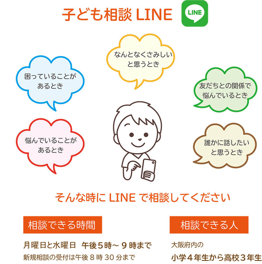 - 子ども相談LINEは、大阪府内の小学4年生から高校3年生が使うことができます